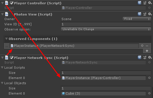 }- Dodaj skrypt PlayerNetworkSync.cs do PlayerInstance i przypisz go do obserwowanych komponentów PhotonView.