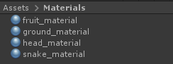 - Teraz dla materiałów , utwórz 4 materiały (Kliknij prawym przyciskiem myszy -> Utwórz -> Materiał) i nazwij je odpowiednio "ground_material", "snake_material", "head_material" i "fruit_material":