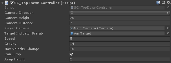 - Na koniec przypisz zmienne "Player Camera" i "Target Indicator Prefab" w SC_TopDownController