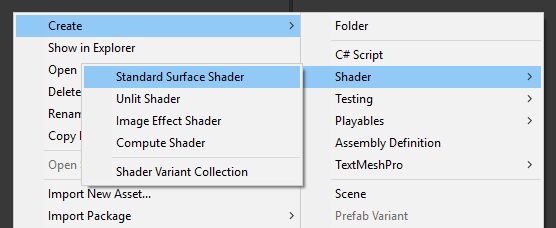 - Kliknij prawym przyciskiem myszy widok projektu -> Utwórz -> Shader -> Standardowy moduł cieniujący powierzchni