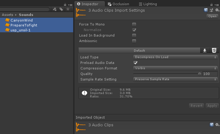 Na przykład w moim projekcie mam 3 dźwięki o różnych celach i jak widać wszystkie mają domyślne ustawienia importu, które nie są odpowiednie dla każdego typu dźwięku.